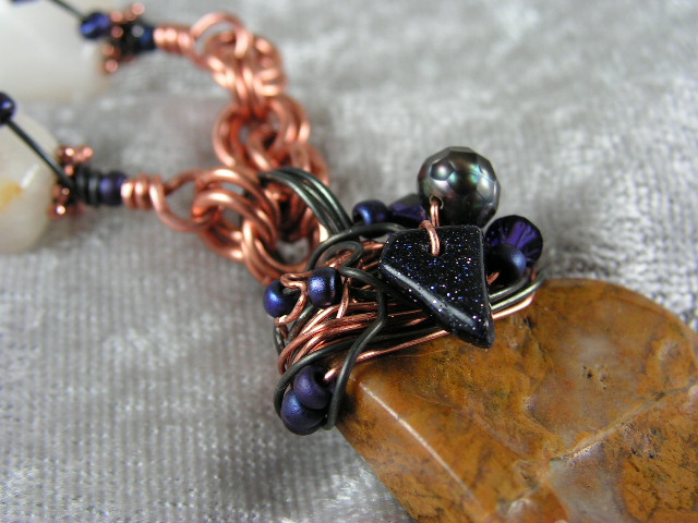 I needed another element to tie it all together, and pulled a few of my favorite books off the shelf for some ideas, and found these coolio wire orbs in A Charming Exchange, by Kelly Snelling & Ruth Rae. I used annealed steel wire and copper wire to make the orbs, and decorated them with some wood grain stone beads (that seriously could be twins of the bamboo agate), more faceted freshwater pearls, and more Swarovskis.