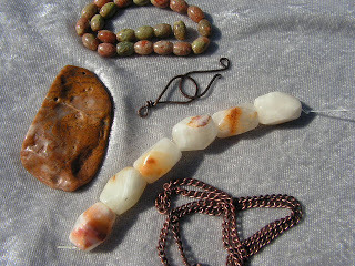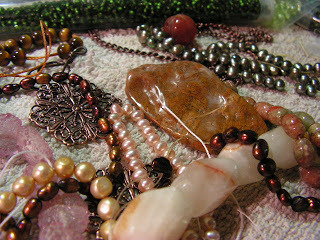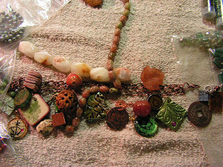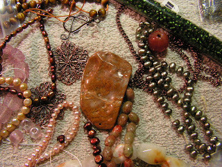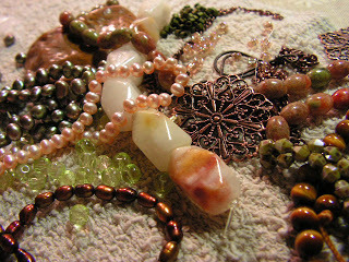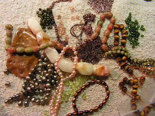 The delightful jasper beads - love the colors in these! I've got some dyed freshwater pearls in cream, peach and sage green, which I think would play very nicely with the jasper.