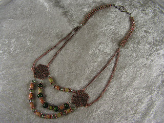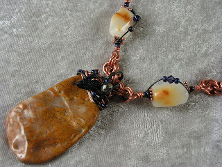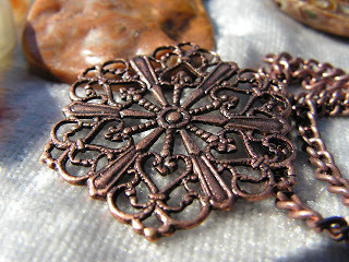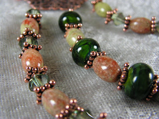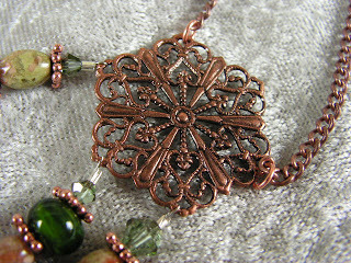 I used Swarovskis in chrysolite satin to pick up the greens in the jasper beads and add some sparkle, especially at the back of the necklace, where the sparkles draw attention to Ambra's lovely handmade clasp.I also used the chain and the two copper filigree pieces Ambra sent, as well as some square copper spacer beads.