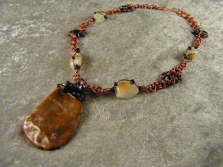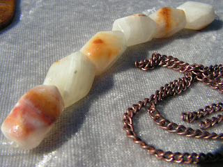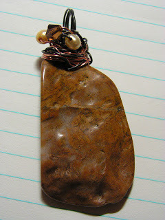 The bamboo agate is really lovely – and ginormous – and way way WAY out of my comfort zone. I have no idea how I'm going to show this piece off. I tried using wire-wrapping to frame the stone, but the wire kind of distracted from the beauty of the stone, and didn't add to it.