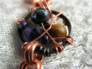 I took Ambra's bowenite beads, and wrapped them with both copper and annealed steel wire, and accented with purpley-blue metallic beads and more purple velvet Swarovskis.