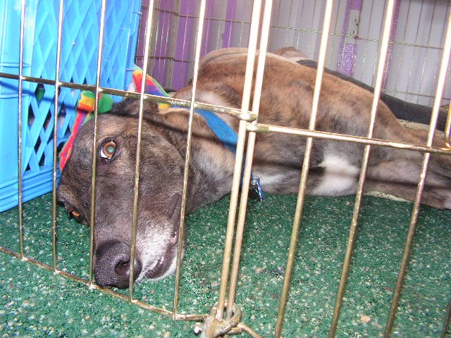 Rufie, doin' time in the pen...Took Mr. Rufus in yesterday morning for the first of his weekly bandage checks...and the vet says it looks GREAT!