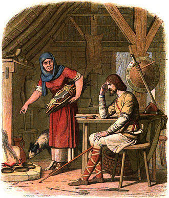 When he was defeated by the Vikings trying to conquer England and driven into the marshes of Somerset, Medb appeared to him in the guise of a peasant and gave him and his small band of men shelter. She pretended to leave him to gather firewood and asked him to watch over some hearthcakes she had cooking by the fire. Concerned for his kingdom, he neglected his promise and the cakes burned. When she returned she scolded him for his error, but he apologized and asked her forgiveness. It was then that she revealed herself and offered him her help, explaining that the cakes were a test: to see if he still had the heart for the coming struggle, which he proved by his neglect. However, his willingness to accept his error rather than "pull rank" surprised and impressed her, in that he could also feel concern for the needs of a subject.