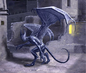 Their bodies look remarkably human, but they have rubbery whale-like skin, huge bat wings, long barbed tails, horns, hand and feet claws, and their feet are as prehensile as their hands. Their most distinctive feature, however, is their blank, featureless faces. They literally have no eyes, ears, noses, or mouths, or anything that could substitute. They look as if they wear plain masks, except they don't. How they are able to sense their surroundings, eat, or drink is also unknown.