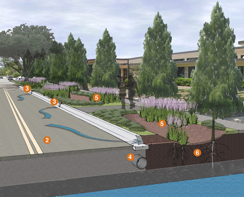 This has several advantages over gutters. The first is that the plants and trees slow the flow of water to prevent erosion; the second is that the plants and their soil/gravel matrix filter out particulates and pollutants before the water reaches the pool; the third is that the plants and microorganisms breakdown the pollutants; and fourth some of the water can penetrate the soil to recharge the water table. Additionally, the bioswale needs little irrigation except during droughts.
