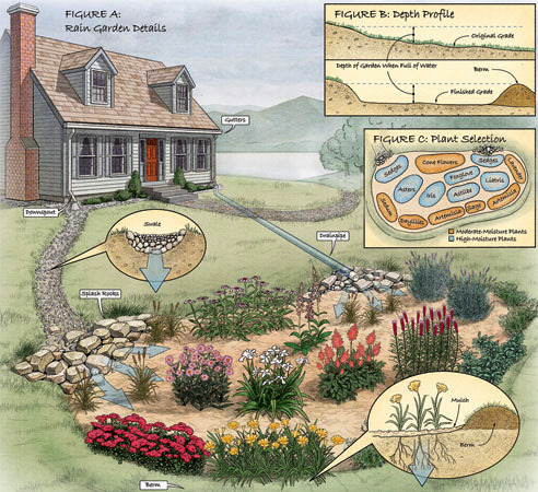 The purpose of a rain garden is to trap and absorb stormwater before it has a chance to pick up contaminants, filter it through plant roots, and allow it to leach into the ground. Rain gardens can be whatever size is needed, from small ones to handle the discharge off the roof of a single house to larger ones meant to deal with flow out of an industrial park. And they are much less expensive to create and maintain than municipal stormwater diversion and treatment systems.