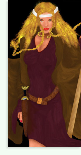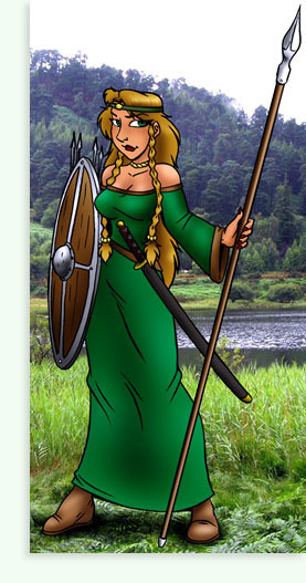 That same year, a minor Fir Bholg chieftain named Eochaidh Mac Eirc was conducting a raid against a Heidhbernigh village allied to the Danann, when he spied a Danann maiden bathing in a pool. He became enamored of her, seized her, and carried her back to his stronghold in Connacht, where he forced himself on her and got her with child. Only afterward did he discover that he had taken a cousin of Nuada, the Danann king, named Cruacha. Having been defiled with alien blood, Nuada refused to ransom her, so Eochaidh sent her to live in a nearby Heidhbernigh village as a bondwoman. The Heidhbernigh were frightened of her at first, partly because of the stories their Fir Bholg overseers told of Danann atrocities, partly because she was so alien looking, and partly because at first her attitude was one of haughty superiority. However, it soon became obvious that she was not used to the drudgery of working in the fields or tending animals, so they took pity on her and adopted her. Medb was born the following year.
