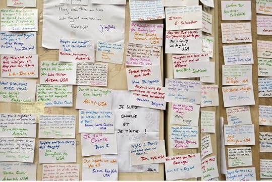 And in many of the notes, I recognized the same desperation I was feeling. People wanted to DO something. But what is a teenager in Missouri going to do? Or a grandmother in Canada? Or a college student in India? Without really thinking it through, I offered to write down personal messages and take them to the memorial where the people of Paris could read them.