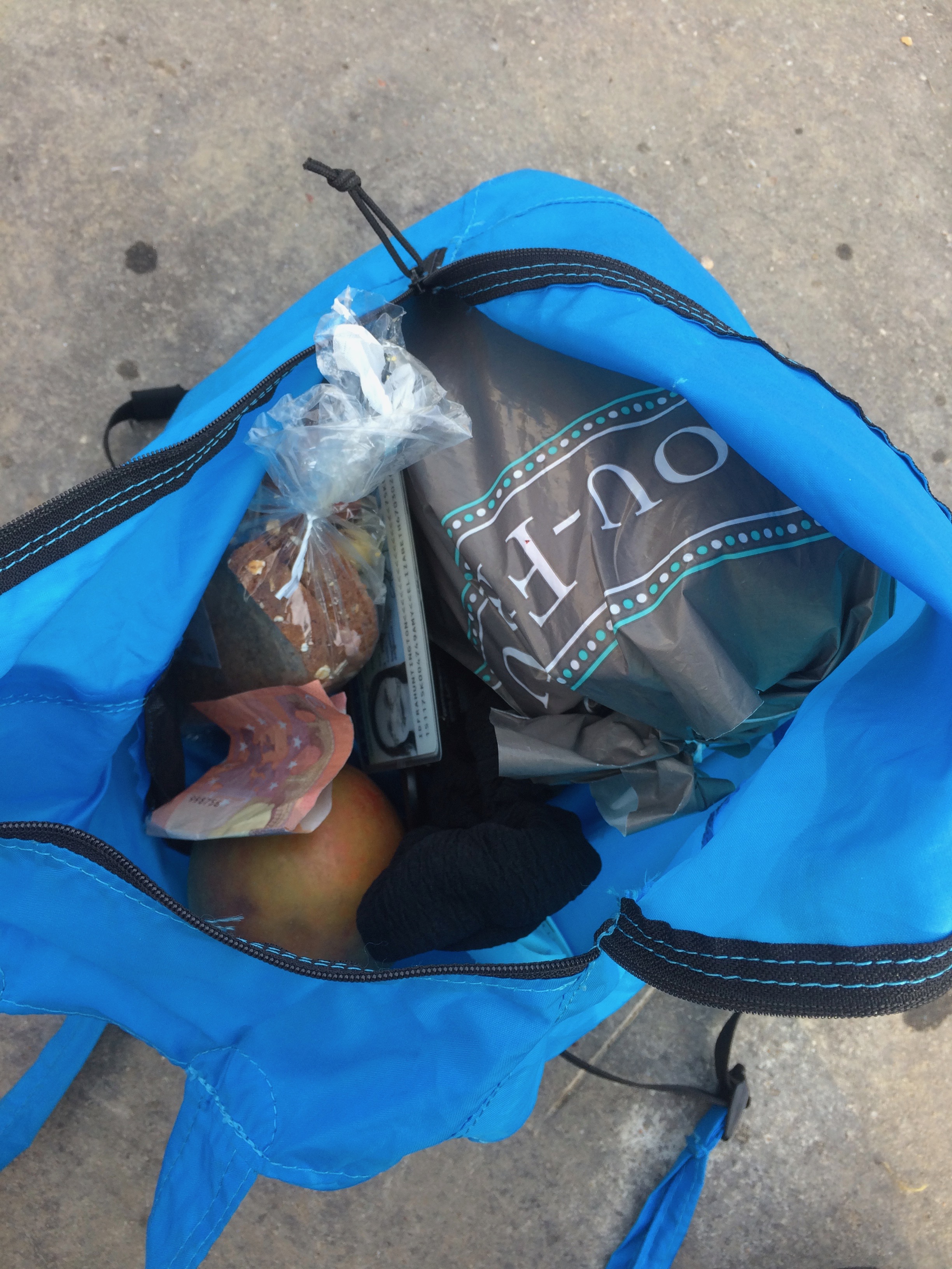 Towel in a plastic bag (because Douglas Adams), apple, sandwich with 10 euros and a metro ticket sealed in the bag with it in case I dropped everything in the water, my identity card in case someone needed to identify my body, scrunchie to tie back hair, and no bottles of water because I knew there wasn’t a bathroom down there.