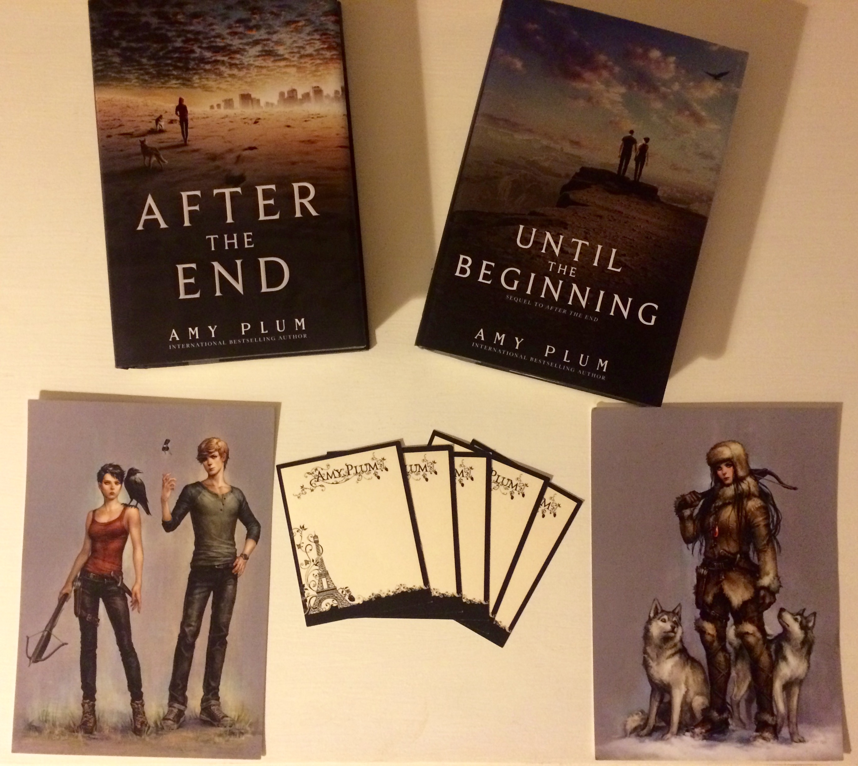 You have a chance to win a fabulous prize pack including signed hardbacks of AFTER THE END and UNTIL THE BEGINNING, 2 fine art postcards of Juneau and Miles by the artist Len-Yan, and 5 signed and dedicated Amy Plum bookplates (to stick in all of your Amy Plum books!) Just rack up points by following the instructions below, and I will put your name in the hat once per point. I will draw randomly at the end of the hunt and announce the winner here on this page.