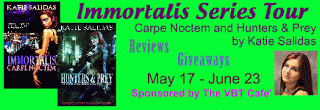 Here are the links to guest posts from Katie and my reviews of her first two books. Enjoy!Immortalis Carpe Noctem Hunters and Prey