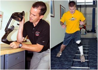 For those who don't qualify for limb reattachment, there have been huge advancements in prosthetics as well. The Intrepid Dynamic Exoskeletal Orthosis (pictured right) was designed by Lieut. Co. Joe Hsu, an orthopedic surgeon; Ryan Blanck, a prosthetist; and Johnny Owens, a physical therapist. It has helped hundreds of veterans since its invention a year ago. It looks and works a lot like a prosthetic, but it fits over the re-attached limb. "The way it works is very much like a runner’s prosthetic," Blanck explains. "As the warrior steps on it and moves forward, the energy of the foot piece is transferred to the back of the foot piece with a spring motion." Soldiers who once limped following limb rehabilitation were back in their original units.