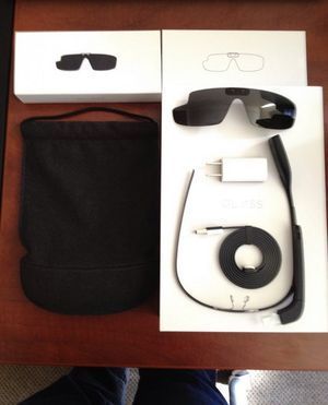 One batch that's making its way around the web comes from Brandon Allgood, the chief technology officer of the data analytics firm Numerate. Brandon is very excited about his new device. He described experience of opening the box as "freeing" and posted some photos to — where else? — Google+. Brandon described the contents of the very Apple-like box and minimal packaging, "This is what you get in the box: two visors [one clear, one tinted], a bag, power cord an of course google Glass!" He also pointed out how Glass does not integrate well with iPhone: