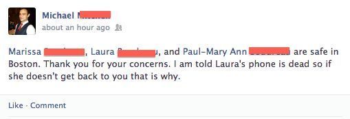 Facebook has proven perhaps an even more useful resource, as an easy way to update many close friends at a time, especially as text messages stopped going through clearly and efficiently. The social network's own version of "at" messages has allowed Boston area residents to send good news to multiple people: