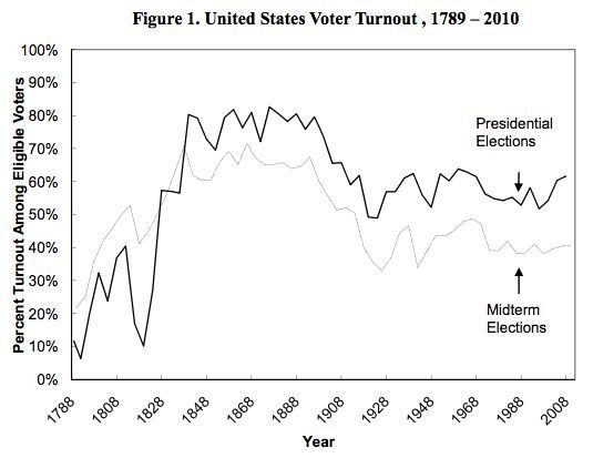 No one should be surprised that Steele's 2010 election went better than Priebus's did in 2012. (Priebus took the chairmanship in January 2011.) As Michael McDonald indicates in the white paper, "Voter Turnout in the 2010 Midterm Election," midterm elections have seen significantly lower turnout for almost 180 years. And lower turnout these days favors older, whiter voters.