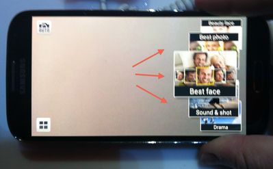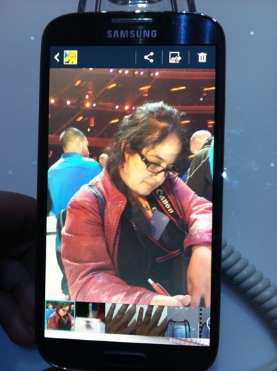 Camera Stuff: When you tap over to the Galaxy S IV's camera functionality, you're greeted with a lot of photo-taking options. It's like the days when everyone got a Canon Powershot camera for the holidays, which they don't anymore for a reason. Some of the camera featurettes make sense — "Night," for example, actually makes your darker photos look. But then there's one called "Beauty Face," which promises — guarantees! — to make people look more beautiful, with face-slimming camera tricks. I tried that out on a woman testing the phone across from me, and she looks this beautiful in person, too: