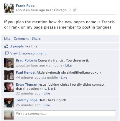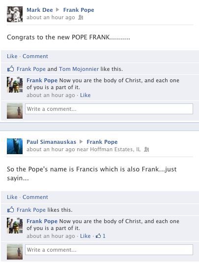As Cardinal Jorge Bergoglio emerged Wednesday at a joyous Vatican and took the papal name Francis, there was no joy on Facebook for guys with the name Francis Pope—or Frank Pope, for that matter. Of course, at least one Franklin "Frank" Pope we found, a 32-year-old Lutheran from Chicago, is used to the ribbing by now. Frank, one of many Popes whose Timelines are beginning to grow holy seeds of bad jokes, runs what he describes as a skateboard contracting company. And his friends on Facebook were the first to connect him to the new head of the Catholic Church: