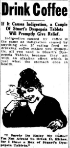 Other ads encouraged people to drink coffee not because it was good for you, but as a way of selling pills for indigestion, like Stuart’s Dyspepsia Tablets, featured in the 1920 advertisement below.