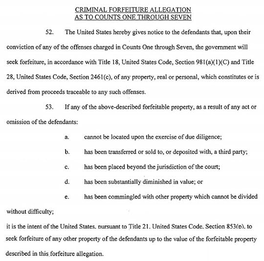 The first is asset forfeiture, a controversial practice in which law enforcement seizes cash and other goods without a warrant. Police might, for example, stop someone with thousands of dollars in cash, surmise that the money is involved in drug transactions, and seize the cash. The problem here becomes clear fairly quickly: Not everyone carrying cash is a drug kingpin; some are (for example) just traveling with their life savings. (Sarah Stillman tells some heartbreaking stories here.) In recent years, a coalition of leftist police reformers and libertarians has mounted a major charge against the practice. But with the Shkreli arrest, even some faithful liberals wondered if this was the one time when seizure might be justified, and the indictment suggests the feds just might try: