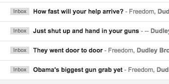Do gun lobbyists work to encourage and exploit this fear? Of course they do. Here’s a series of recent emails on the mailing list of the National Association of Gun Rights, which split from the NRA because it considered the older organization too soft: