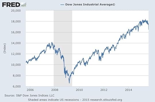 Some economists and commenters have already been pointing to the reasons not to panic. For example, this is the chart of the Dow’s 10-year performance for some perspective: