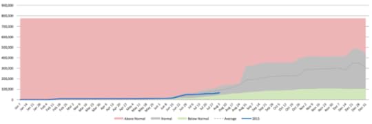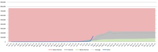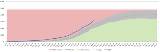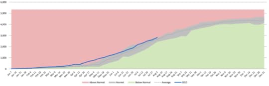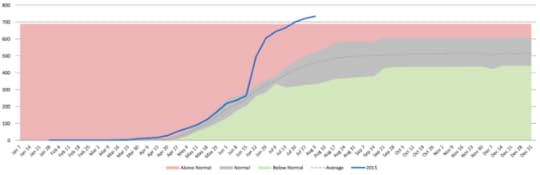 So far this year, as the following NIFC charts show, the cumulative total of fires has been just above average. Meanwhile, the total acreage of fires has been about normal. Here’s northern California: