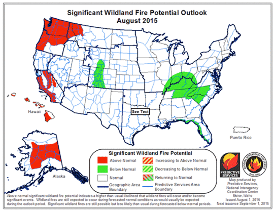 Meanwhile, the wildfire outlook shows signs of improvement across the country. Here’s a GIF that shows the conditions from August through the fall. Bear in mind that under “normal” conditions, there will still be plenty of fires.
