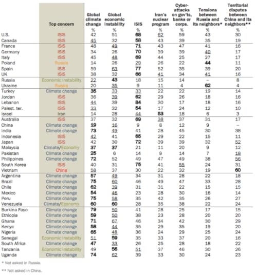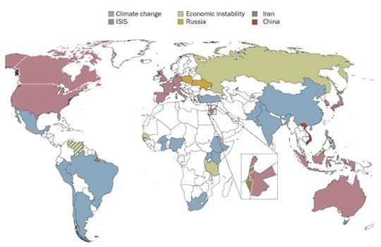 The Pew report doesn’t just chart the geography of alarm about Iran amid international efforts to restrict that country’s nuclear capabilities. It also reveals notable regional trends in what people consider threatening. Concern about climate change is most pronounced in Latin America, Africa, and Asia; fear of ISIS is most evident in North America, Western Europe, Australia, and the Islamic State’s neighbors in the Middle East. Economic instability is a secondary concern in many places, while cyberattacks tend to be downplayed as a danger throughout the world.