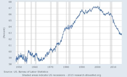 The more concerning signs are hidden beneath the surface. Some people have been sounding the alarm about labor-participation rates for years now—Republicans tried, mostly unsuccessfully, to make them an issue in the 2012 election. But as several analysts have pointed out, the June rate of 62.6 percent is the lowest since October of 1977. The decline is part of a long-term trend, as this graph shows: