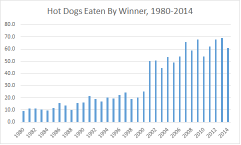 There’s no eating tactic that can yield the significant increases in efficiency witnessed at the turn of the century. When Chestnut defeated Matt Stonie 61-56 in last year’s contest, it was a simple matter of athletic prowess—yet it’s a difference of less than 10 percent, a far cry from the nearly 100 percent difference between the 2000 and 2001 winning totals.