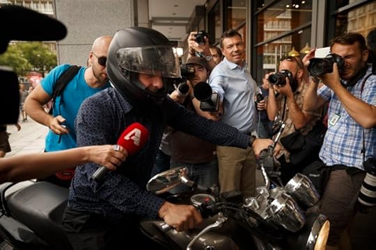 Greece’s finance minister Yanis Varoufakis is mobbed by reporters as he leaves his office in Athens on motorbike to meet with Prime Minister Alexis Tsipras at Maximos Mansion.