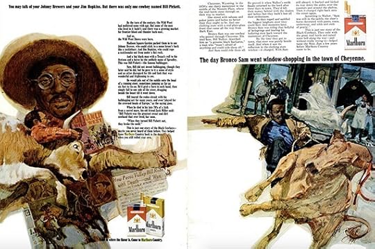 Those ads appeared in Ebony magazine in July 1970 and June 1970, respectively, and they featured Bill Pickett and Bronco Sam, two black cowboys from the late 19th century. The ads flopped. Another one I saw in the Smithsonian archives, from 1968, features a standard scene of the Marlboro Man riding a horse juxtaposed with an inset of a formally-dressed black couple lighting a cigarette: “Come to Marlboro Country.” It’s as if Philip Morris just slapped a stock image of African Americans onto an existing ad, and the contrast looks bizarre.
