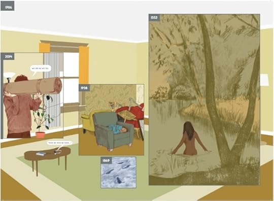 Concurrently, you have this Native American woman in 1352, approaching a lake. And instead of being transfixed by her image in the water, she dives in—the water isn’t a reflective surface, it’s something to plunge into, through. That’s what the book as a whole is constantly refiguring: As much as we can find our reflections in these panes, we can also dive into them, past them. That’s the potency of Here—a room is far more than the walls we’ve built; it’s a here and now alive with transcendent echoes of a world that’s constantly and continuously changing.
