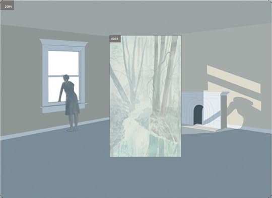 It’s a woman standing at the window. She may have just closed the window, she may be about to open it. There are no curtains. It’s all in 2014. And we see her shadow cast across the fireplace. In the middle, going across the spread is this beautiful pane that just shows the forest and stream and again there’s this little bit of reflection in the water, inviting us to look beneath it but at the same time denying us. Our bodies cast a shadow, but nature doesn’t—instead, it throws light. That idea is constantly in this book: The natural world casts light on where we are, and who we are, and what we’re becoming, and what we’ve been.