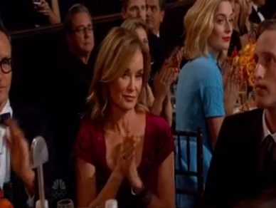 Actual Winner: Jon Voight. His FOURTH Golden Globe, after Runaway Train, Coming Home, and Midnight Cowboy. That puts him one up on his daughter, Angelina Jolie, and don't think he doesn't know it. He picks up the "nervous" meme from Jennifer Lawrence and Elisabeth Moss. And he gets played out by the band just as he's making an oblique reference to Angie/his family.