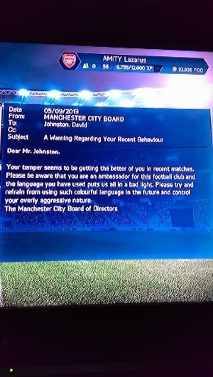 One of Reddit's top rated posts today comes from user "Rossboomsocks", who posted the picture at right showing that the game's sensors are listening. Framed as a warning from "Manchester City's Board of Directors," (the franchise that he controls) the message reads that "the language you have used puts us all in a bad light. Please try and refrain from using such colourful language in the future and control your overly aggressive nature." Apparently, Mr. Rossboomsocks had been a bit too vocal in his surely tasteful and respectful disagreements.