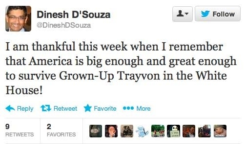 Since author and Obama-disliker Dinesh D'Souza wrote a book declaring The End of Racism (three bucks at Amazon), it was not racist when he on Tuesday referred to the president as the "Grown-Up Trayvon in the White House." Can't be. Racism is over.