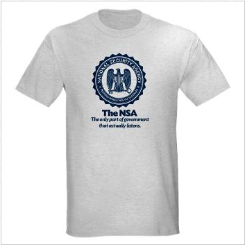 That's what Zazzle did, too. Zazzle is the hyperactively-named company that played host to a t-shirt using the NSA logo in a parody design. We've reported on this before. The t-shirt showed the logo, then reading: "The NSA / The only part of the government that actually listens."