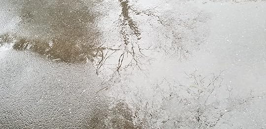 I lower my gaze and—look at that—the bare trees reflect in the puddle and the raindrops dream up perfect round eddies like notes from a song.