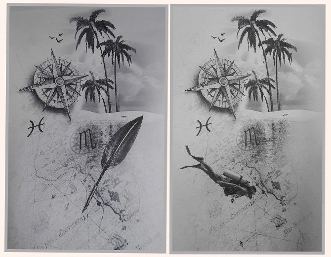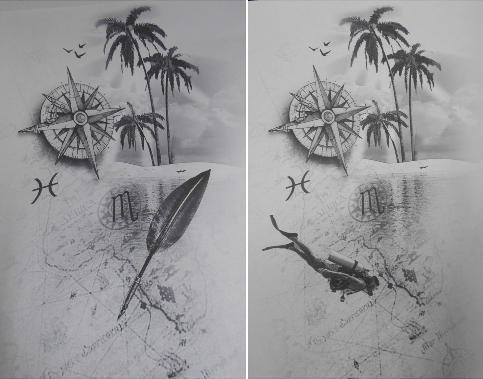 Both tattoos have a compass and a map and palm trees and our astro signs.