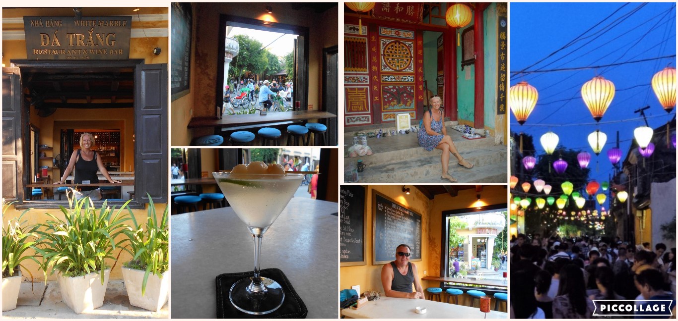 The Old Japanese Bridge in Hoi An VietnamOne of our favourite spots in the Old Town was the White Marble Bar – where you can sit in the open (no glass) windows (opposite a fan!) with a vodka lychee martini cocktail (oh wow – they were good!) and watch the world and the hundreds of beautifully dressed Chinese tourists wearing Vietnamese hats being transported around in those cycle tuk tuks.