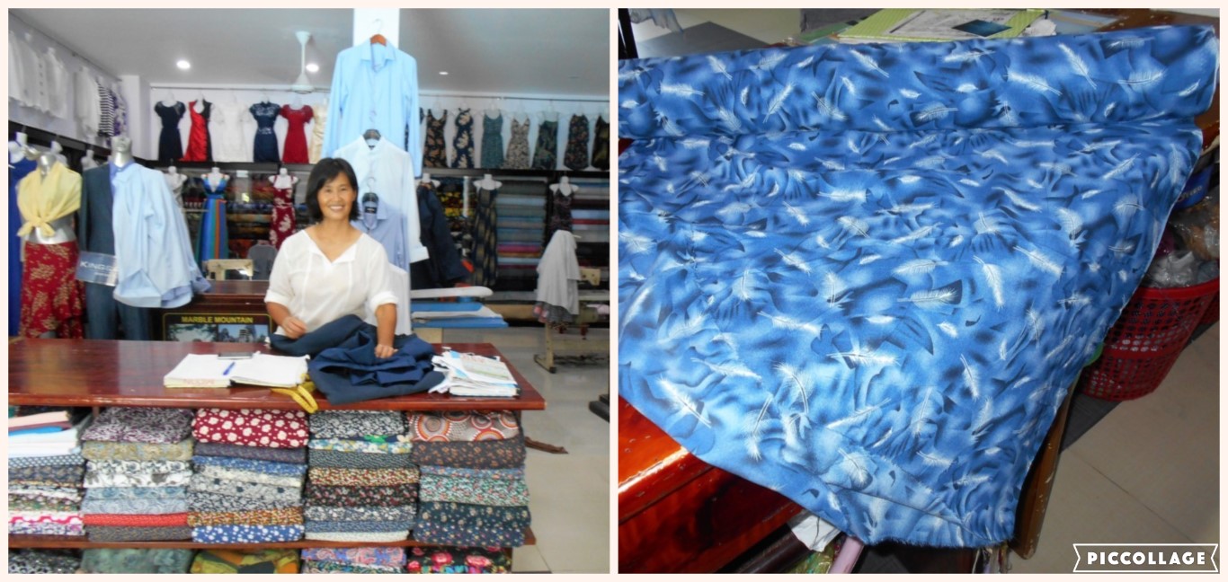 Hoi An is also very famous for its tailors. You can get beautiful clothes made to measure very inexpensively here. It seems that every Vietnamese in the town is a dressmaker or seamstress – as was our landlady, Moon. I had a dress made by her during our stay (that's the fabric below right) and Trav had two linen shirts, a pair of smart city trousers, and his old denim shorts that were falling to bits perfectly replicated. We were delighted. You'll see the resulting outfits being worn in an upcoming blog post!