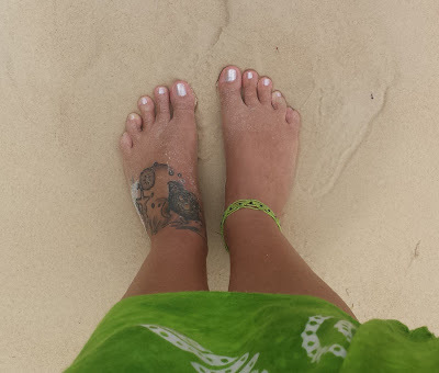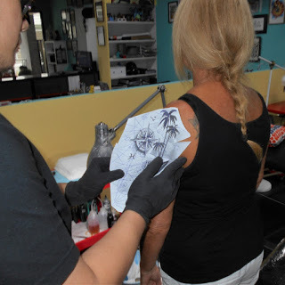 I'd rather be getting tattooed!We wanted a compass and a map as the main theme with individual touches such as our astrology signs of Scorpio and Pisces. We wanted palm trees to represent our love of tropical places and three little birds in flight to represent our three boys flying the nest. I wanted a quill pen to represent my writing and Trav wanted a diver to represent his passion for scuba diving.