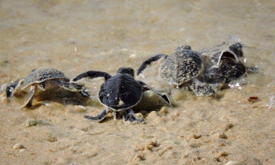 After finding a spot high up on the beach above the tide line, the turtle will begin to dig with her front flippers, thrashing about until she is in a deep pit. Once she feels she is below the natural line of sand she will lay her eggs in a chamber within the pit. Once she starts to lay she enters into a trance-like state and cannot stop laying until she has finished. She then spends a considerable time burying them until, quite exhausted, she drags her considerable weight across the beach and back into the sea.