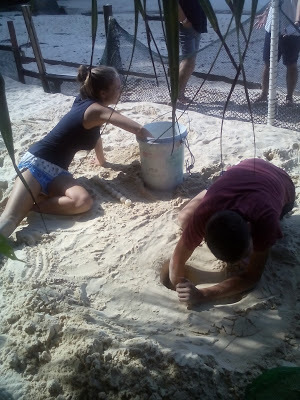 Turtle sanctuary staff Holly and James very carefully transferring eggs to the hatcheryWhile I was busy at the turtle sanctuary, Trav was diving, and when I wasn’t monitoring turtles on the beach I was out snorkelling with turtles and with my new friend Sally together with our island guide Janet. We took a boat out to explore some small uninhabited islands with the most gorgeous beaches and clear warm waters and coral reefs teeming with fish and turtles. Some of the best snorkelling ever because I got to swim with turtles too!