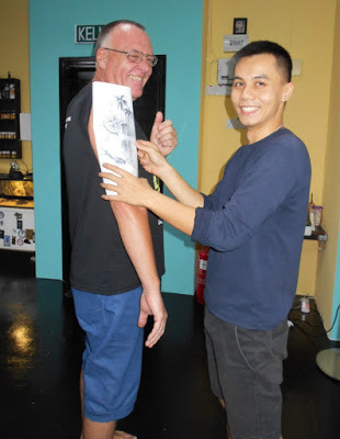 These are our final approved designs. Mine on the left. Trav's on the right.We consulted with the very talented young artists and tattooists at The Tattoo Parlor Malaysia at Petaling Jaya, Kuala Lumpur. It took many hours of consultation and skill and patience for them to fine-tune our ideas and to get the tattoo designs just right for us. During this time, while tattoo artists Bruce and Oren Lee were busy designing, Cheryl the owner of the shop looked after us, bringing us coffee and food. The atmosphere in the shop was really friendly, fab, and fun.