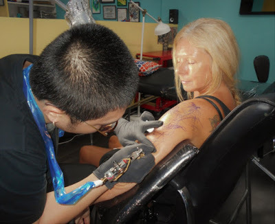 Tattoo artist Bruce Lee positions the design template onto Trav's arm