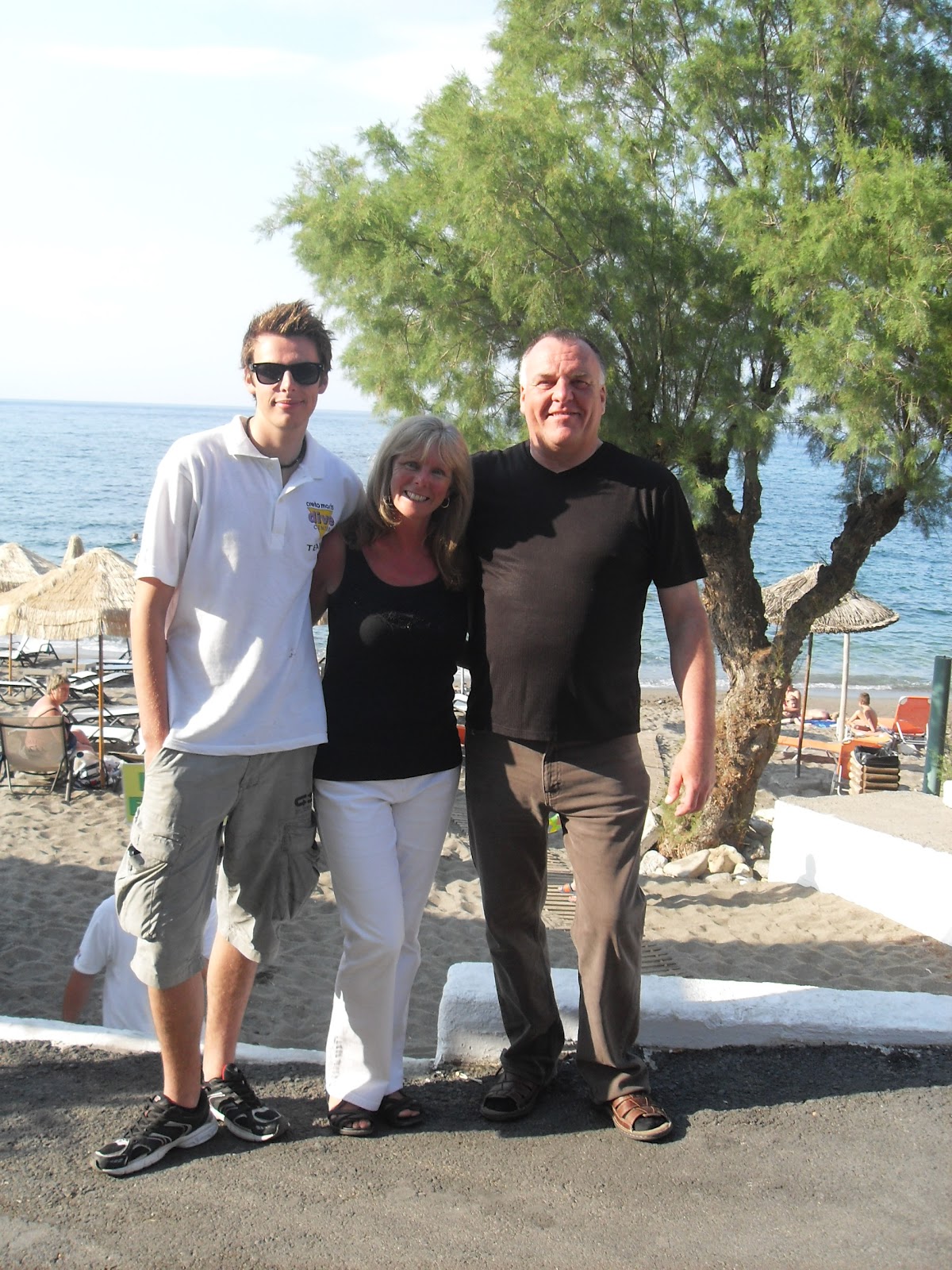 I didn’t make it back to bloggerland last Friday as I was away in Crete visiting Iain, son #3, who is working over there as a Scuba Diving Instructor. While we were away, Mr JH went diving every day with Iain and his team, while I soaked up the hot and wonderful Cretian sunshine on the beach and read my Kindle! It was also our wedding anniversary while we were there and we had a lovely time celebrating in a traditional taverna. This photo is of Iain, me, and Mr JH.