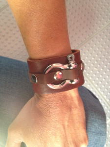 The CONCHO is a wraparound-style bracelet made of either black or brown 1/2 inch wide Latigo leather, a cattle hide leather which is used for saddlery work and numerous other outdoor uses, wherever a supple, durable leather is needed. The bracelet is over 30 inches in length and designed to wrap itself 4 times around your wrist. It is adorned with a “concho,” a decorative metal piece that is usually added to leather items such as saddle strings. While conchos can be very intricate in their designs, this one is made of either stainless steel (silver) or solid brass (gold) and polished to a mirror-like finish.