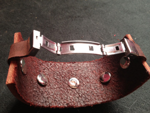 It is available in two colors, brown and black (brown is 1 5/8 wide and black is 1 1/4) and 2 standard wrist sizes, 7 1/2 and 8 1/2 inches long.